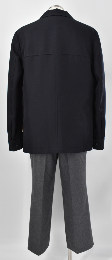 MARNIのジャケットに優しい色味のロゴスウェット、DAKSのグレーのきれいめスラックスを合わせた落ち着いたスタイル。