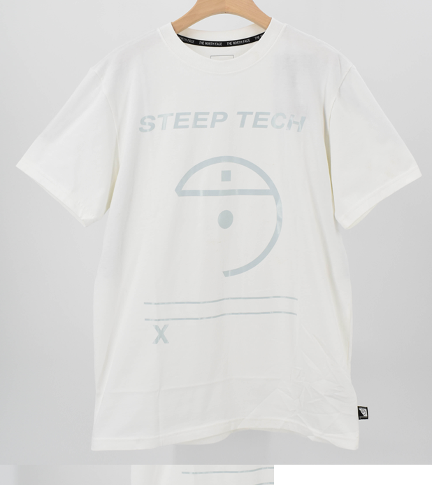 ホワイトが爽やかな印象を与えるTHE NORTH FACEの「STEEP TECH」Tシャツ。コットン素材で着心地抜群。フロントに配置された幾何学的なグラフィックが都会的なアクセントに。