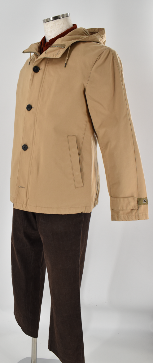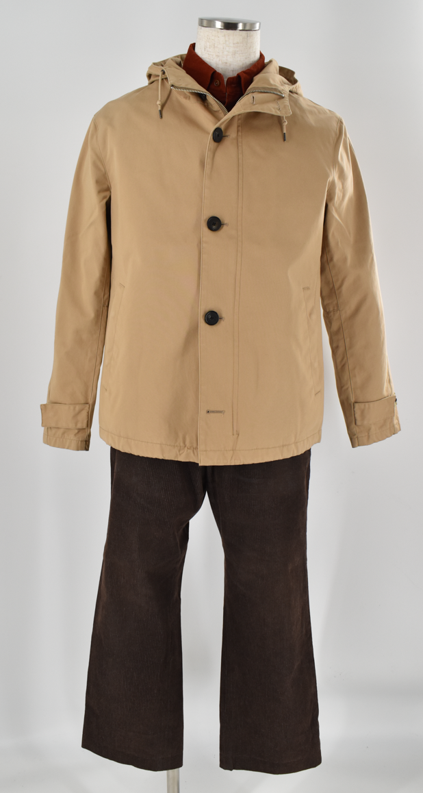 優しいベージュのフードジャケットに、深みのあるコーデュロイのシャツ、コーデュロイパンツを合わせたコーディネート。