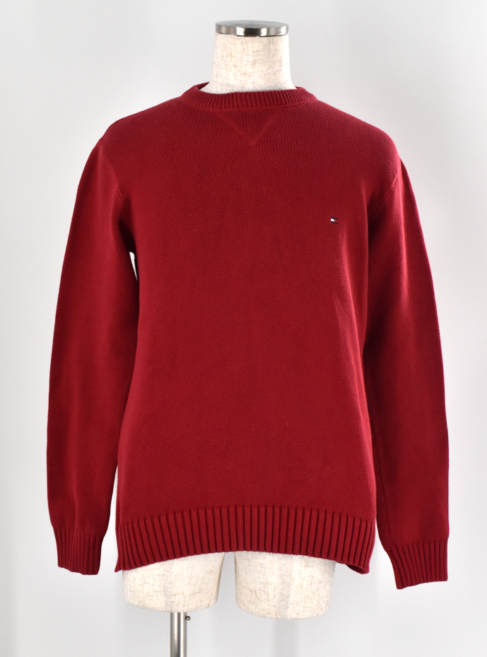 深みのあるレッドカラーが目を引く、Tommy Hilfigerのクルーネックセーター。