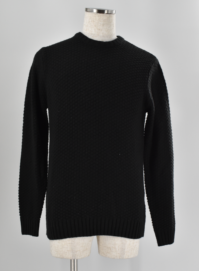 シンプルながら編み柄に表情があるクルーネックセーター。黒でも重たく見えにくく、コーディネートに立体感をプラスしてくれます。
