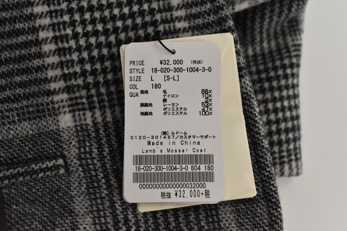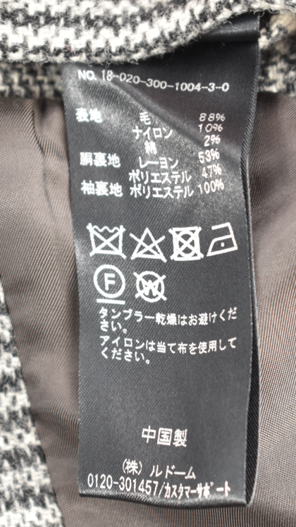 表地 毛 88% ナイロン 10% 綿 2% 胴裏地 レーヨン 53% ポリエステル 47% 袖裏地 ポリエステル 100%