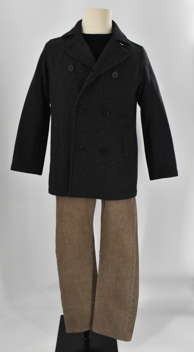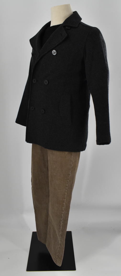 ダークグレーのダブルコートを主役に、落ち着いたブラウンのパンツを合わせたコーディネイトです。