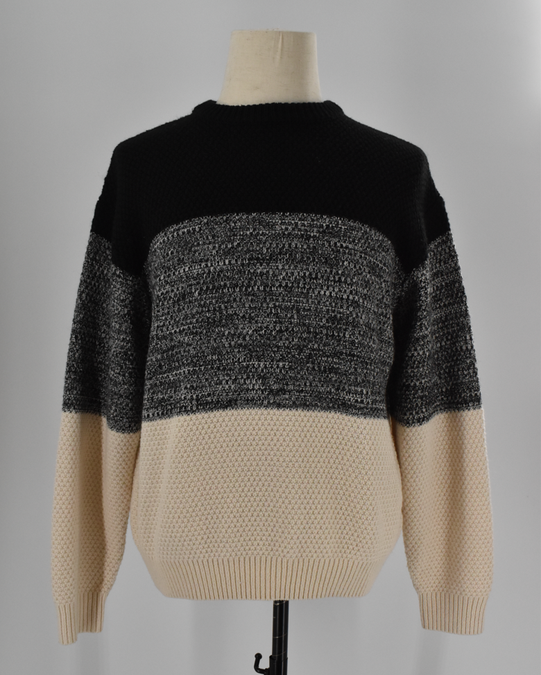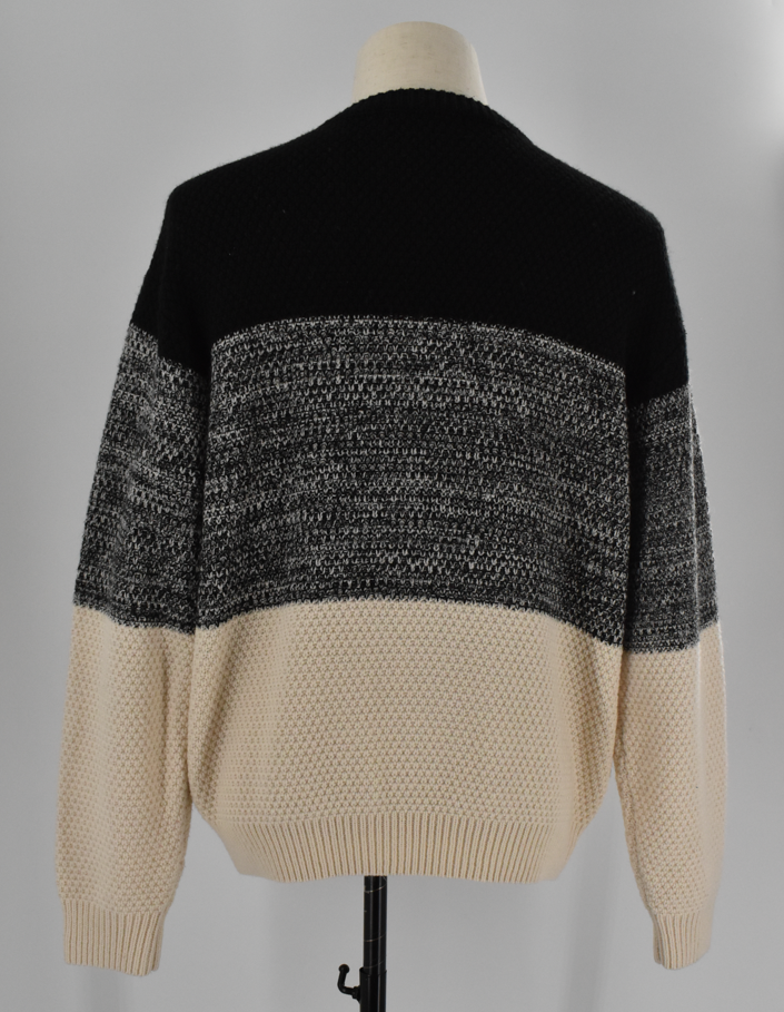 ブラック、グレー、アイボリーを切り替えた配色が特徴の、ほどよい存在感のあるnano・universeのセーターです。程よい厚みで一枚でもインナーとしても使いやすく、コーディネイトのアクセントとして活躍します。