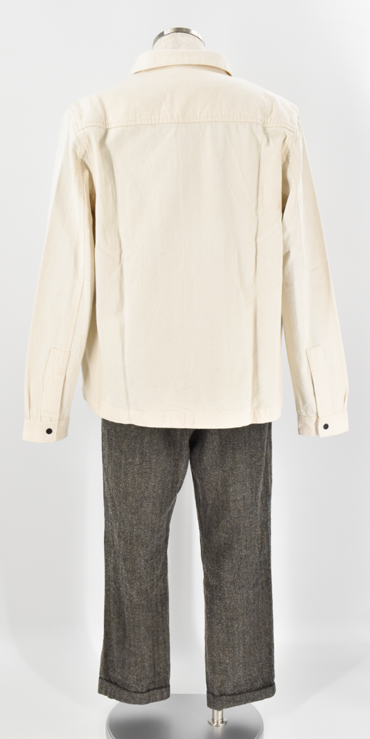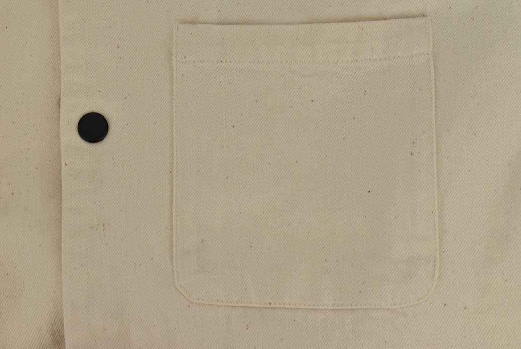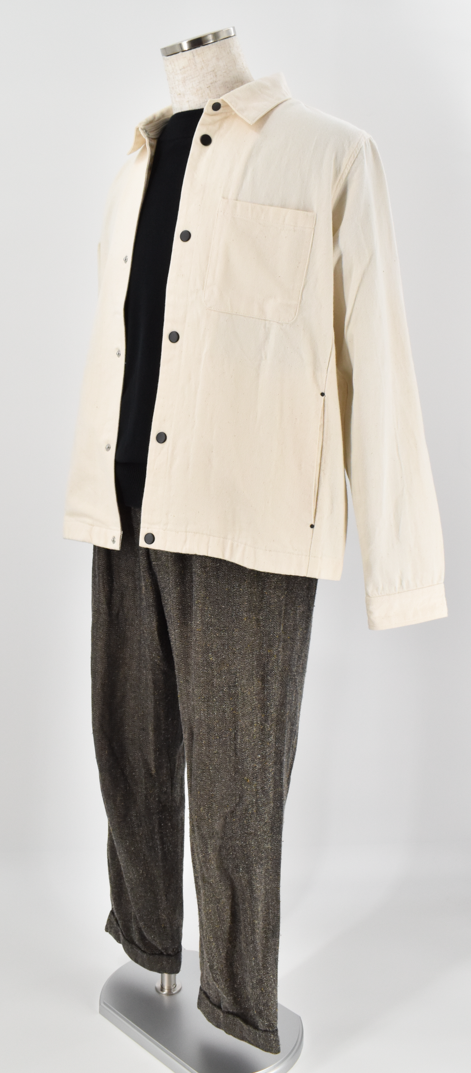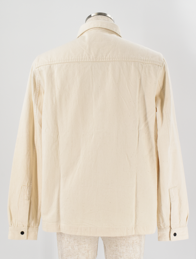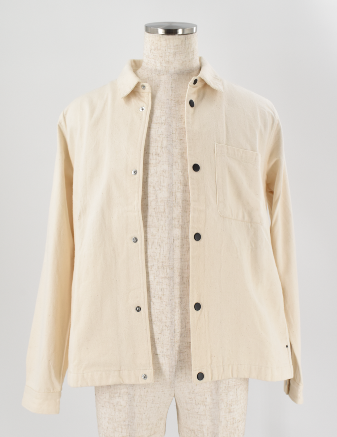 ナチュラルな風合いが魅力のライトベージュのシャツジャケット。コットン100%の素朴な生地感がやさしい表情を生み、黒ボタンがさりげないアクセントに。羽織るだけで柔らかな雰囲気を添えてくれる、シンプルながら存在感のある一着です。