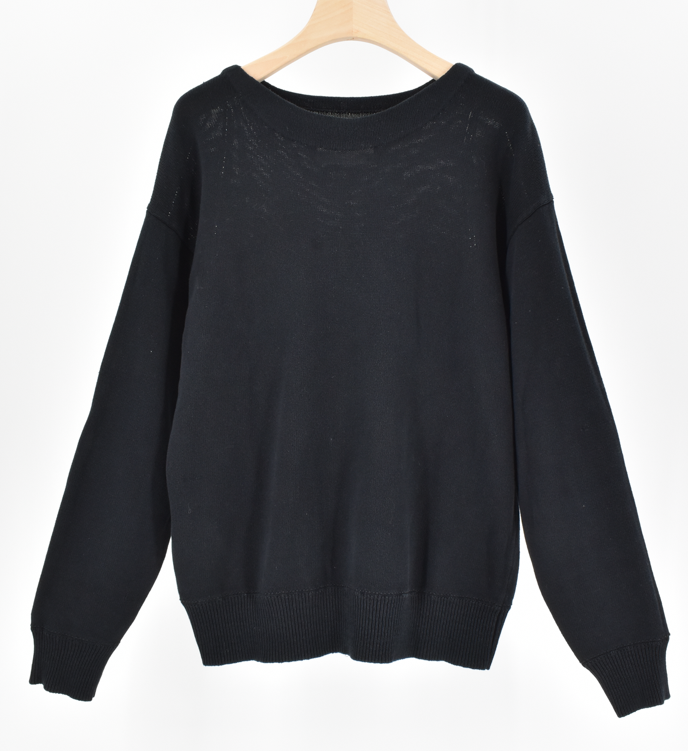 MHL.のシンプルなコットンニット。コットン素材のやさしい風合いで、ゆるやかなシルエットがリラックス感を演出。シンプルながらしっかり表情のある一枚です。