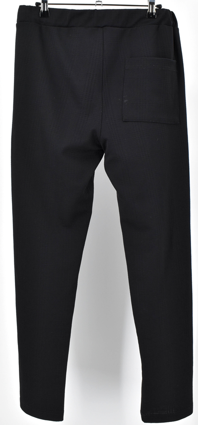 ウエストの総ゴム入りなので締め付け感が全くなく、ストレッチが効いていて、まるでスポーツウェアのような履き心地です。表面は黒一色ではなく、グレンチェック風な模様があります。